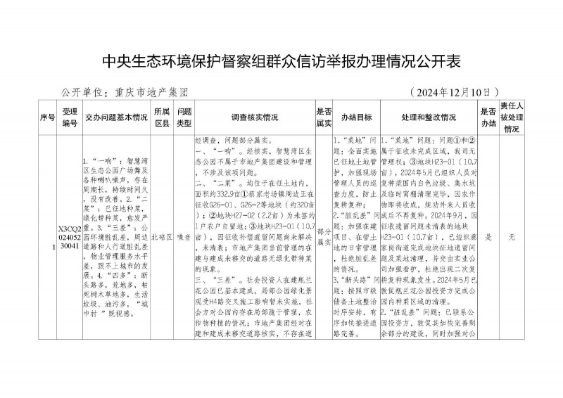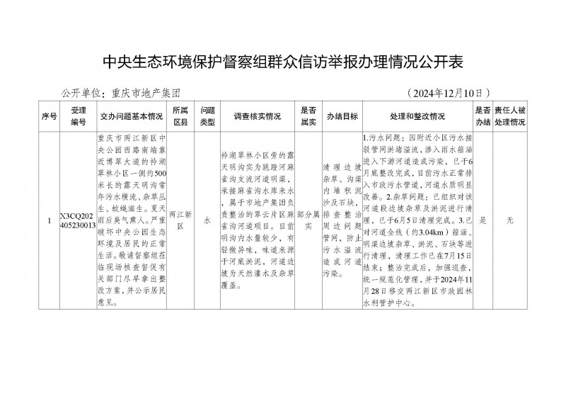 根據(jù)《關(guān)于加強中央生態(tài)環(huán)境保護督察交辦群眾舉報件辦理工作的通知》(渝環(huán)督辦發(fā)〔2024〕13號)要求,群眾舉報件辦結(jié)驗收后,各整改責任單位應填寫舉報辦理情況公開表,在區(qū)縣、市級部門或市屬國有重點企業(yè)門戶網(wǎng)站上對外公示群眾舉報件辦理情況,接受社會和群眾監(jiān)督,公示期應不少于10個工作日?,F(xiàn)按照生態(tài)環(huán)保督察相關(guān)要求對受理編號X3CQ202405230041、X3CQ202405230013兩件群眾舉報辦理情況公開表對外公示,公示時間為2024年12月12日-12月25日,聯(lián)系電話:63629733。