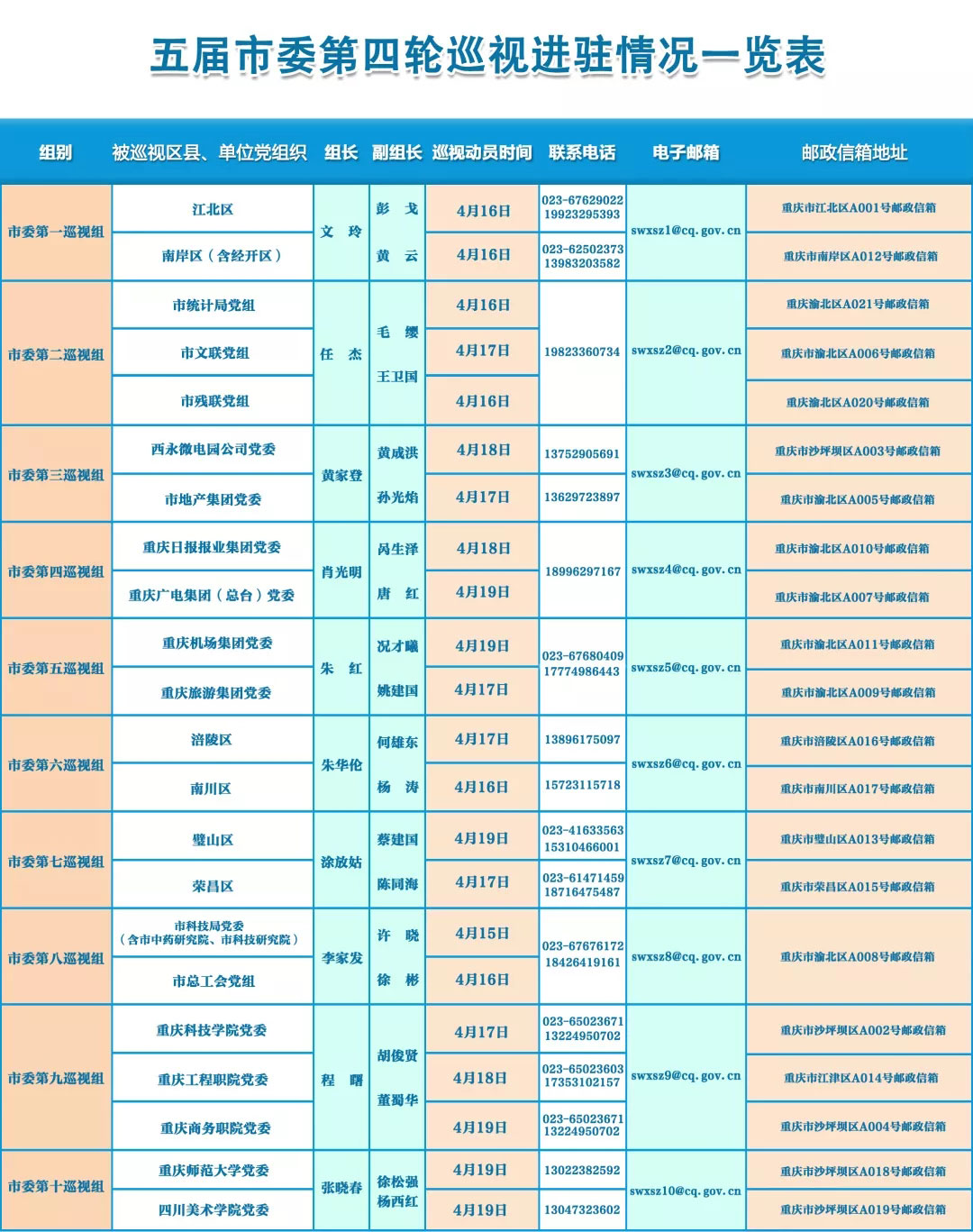 近日,重慶市啟動五屆市委第四輪巡視。經(jīng)市委批準,五屆市委第四輪巡視共組建10個巡視組,采取“一托二”“一托三”方式,對涪陵、江北、南岸(含經(jīng)開區(qū))、南川、璧山、榮昌6個區(qū),市科技局(含市中藥研究院、市科技研究院)、市統(tǒng)計局、市總工會、市文聯(lián)、市殘聯(lián)、重慶日報報業(yè)集團、重慶廣電集團(總臺)7個市級部門單位,重慶師范大學、四川美術(shù)學院、重慶科技學院、重慶工程職院、重慶商務(wù)職院5所市屬高校,重慶機場集團、市地產(chǎn)集團、西永微電園公司、重慶旅游集團4家市屬國有重點企業(yè)黨組織開展為期2個半月的常規(guī)巡視。巡視期間,同步開展意識形態(tài)工作責任制落實情況、選人用人情況和區(qū)縣黨委巡察工作情況專項檢查。